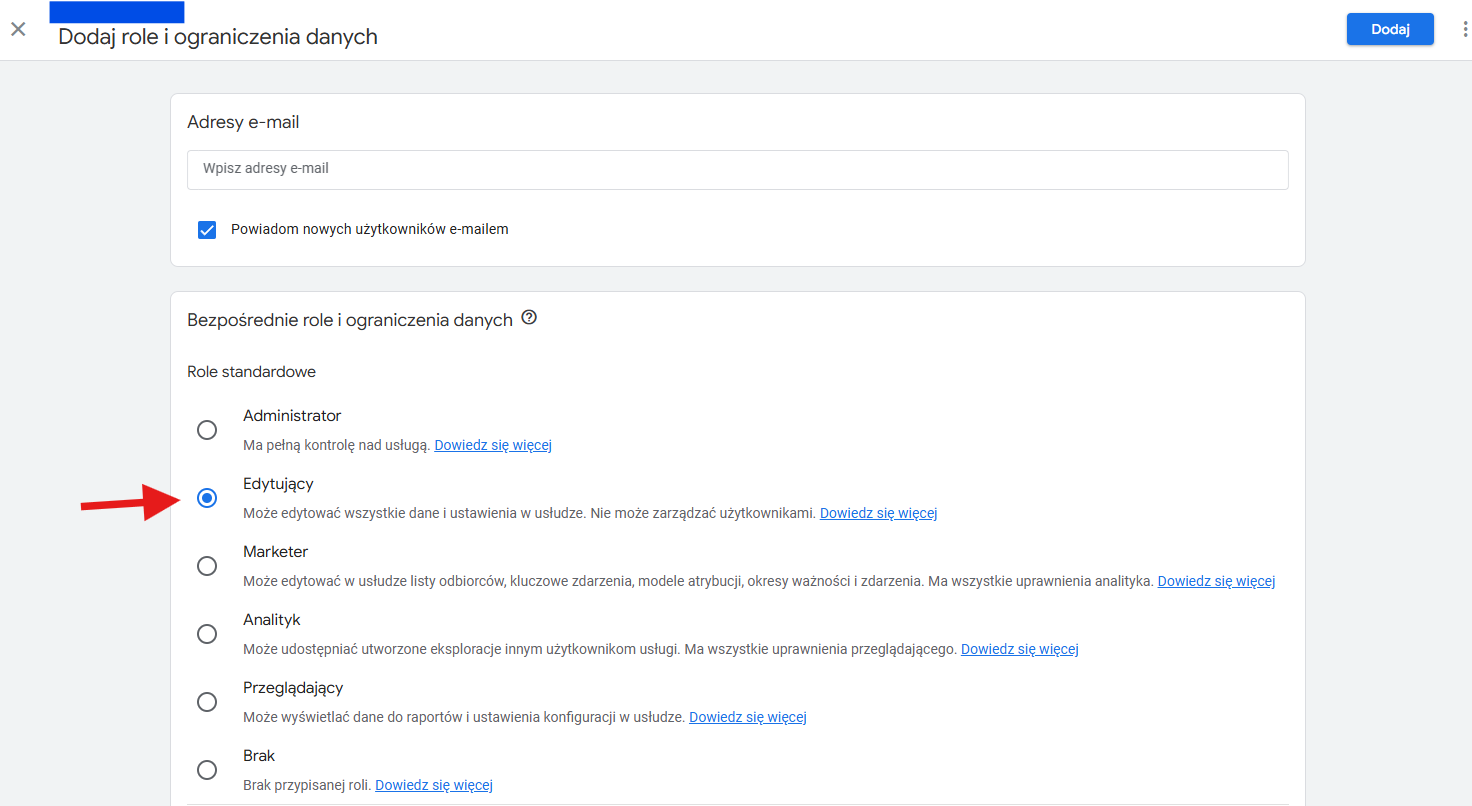 4. Zaznaczanie Roli: Poniżej pola e-mail znajduje się sekcja Bezpośrednie role i ograniczenia danych. Z dostępnych pól należy wybrać opcję Edytor (Editor).