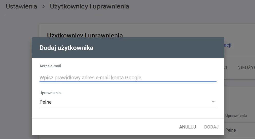 Gdy już wiesz, jaką rolę chcesz nadać, możemy przystąpić do działania. Poniższa instrukcja przeprowadzi Cię przez proces nadawania dostępu w GSC.