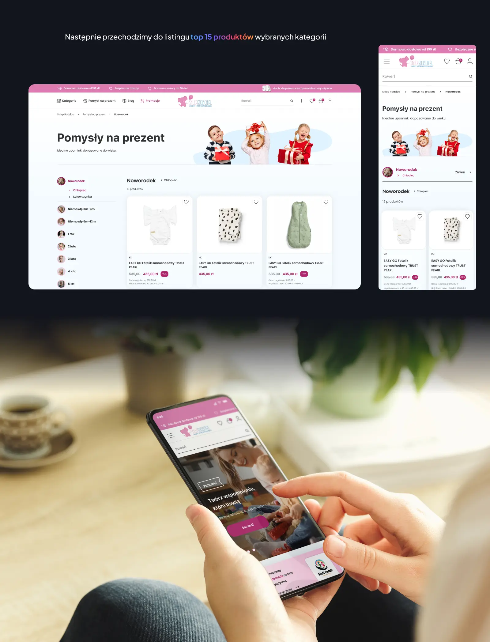 Intuicyjny design oparty na podejściu Mobile First, pozwolił zbudować spójny system ułatwiający decyzje zakupowe rodziców.